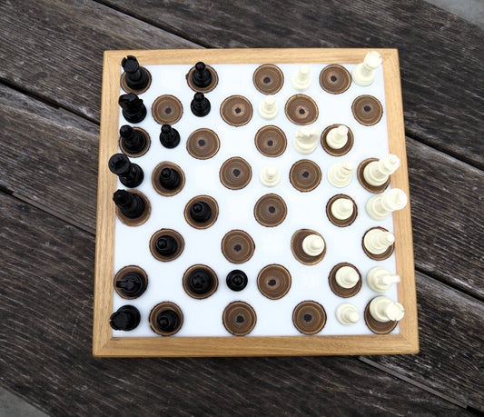 Schachbrett mit Holzästen u. weißem Epoxidharz